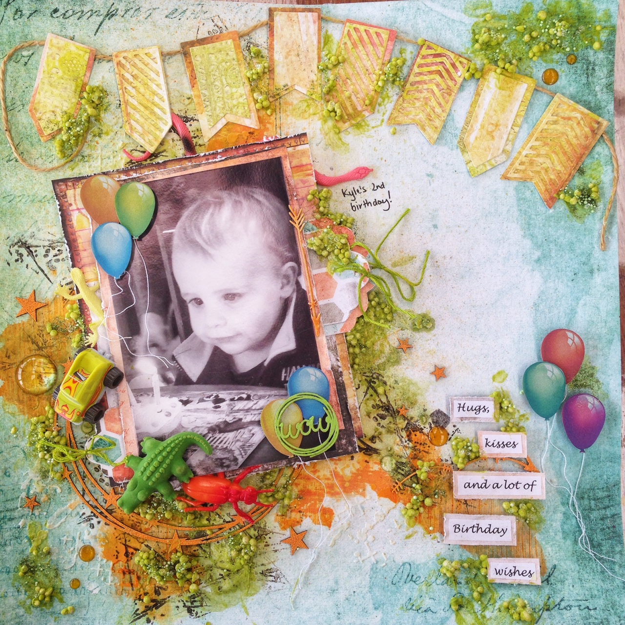I've tucked a couple of tags in behind the photo and incorporated bright colours, balloons and a few small toys.